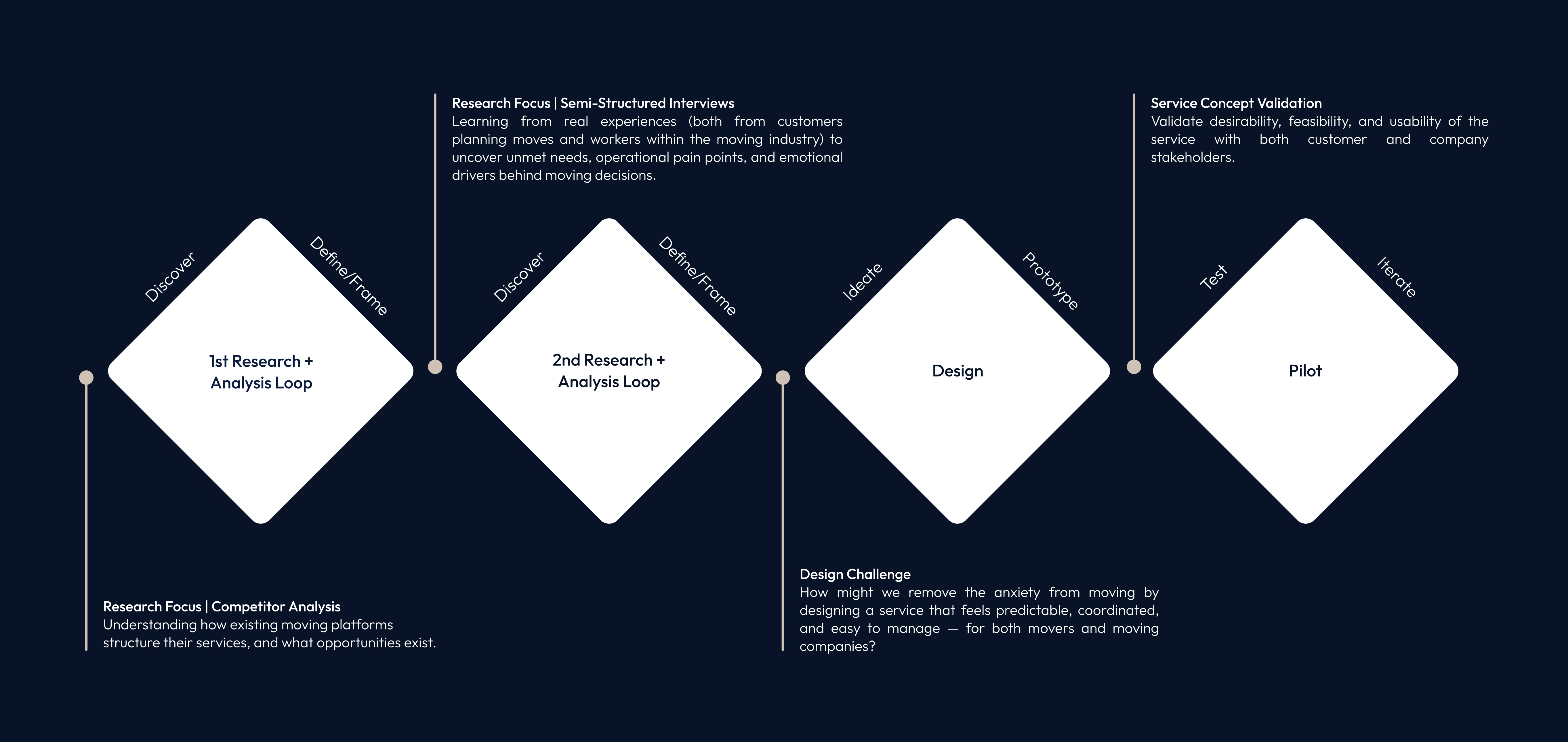 Conducting interviews also helped counter a major limitation in my position: I was designing for a U.S.-wide service while not residing in the U.S. myself. The country’s scale, regional differences, and variation in moving norms meant I couldn’t responsibly generalize from surface-level research. Speaking directly with people who were preparing to move, as well as professionals with years in the moving industry, allowed me to uncover emotional dynamics, operational constraints, and contextual nuances that would never surface in desk research alone.