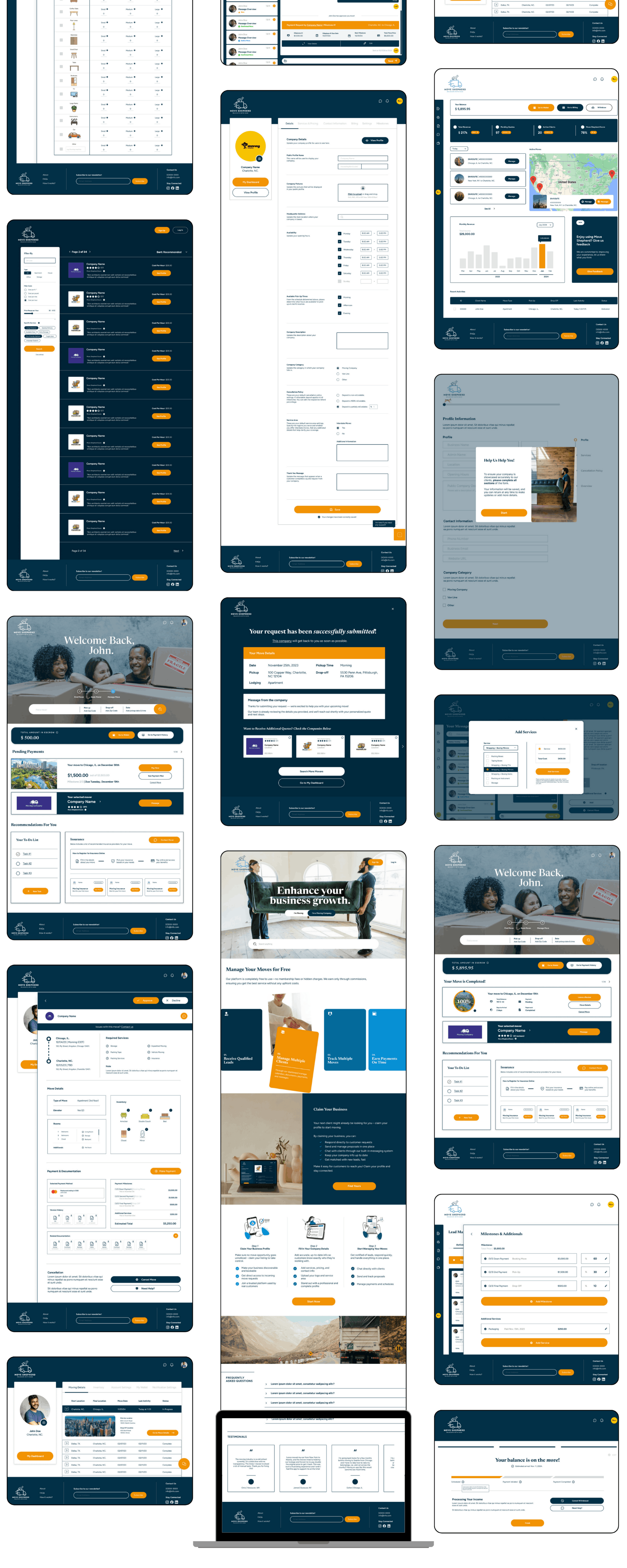MoveShepherd is a two-sided moving-services platform designed to bring clarity, trust, and operational efficiency to one of the most fragmented service industries in the U.S. The project reimagines how individuals plan and manage household moves while giving moving companies a modern, centralized system to handle quotes, workflows, payments, and client communication.